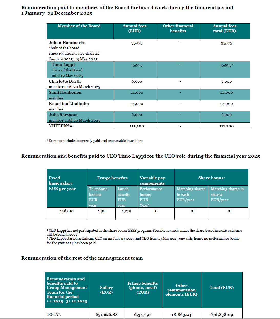 EUR 3,500 per month will be paid to the Chair of the Board of Directors and EUR 2 000 per month to the other members of the Board of Directors. Travel expenses will be reimbursed in accordance with the maximum amount of the current travel allowance base set by the Tax Administration. The remuneration of the Board of Directors was not increased compared to the previous year.